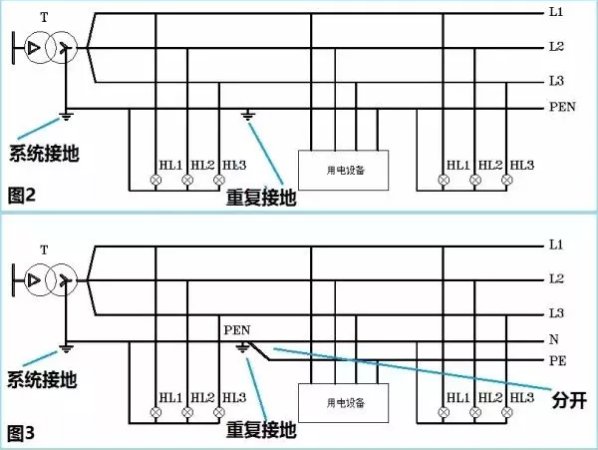 注意哦,圖2對應的接地系統叫做TN-C,而圖3對應的接地系統叫做TN-C-S。