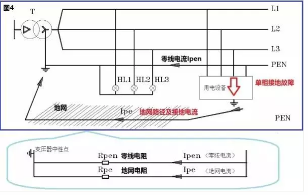 我們看圖4的下圖,我們發現當L3相對用電設備的外殼短路時,保護性中性線中有電流流過,地網中也有電流流過。