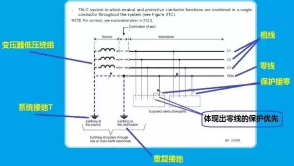 知曉這幾個概念后,我們來看看IEC給出的有關TN-C和TT系統的原圖。注意,這兩幅圖是不容置疑的,是有關接地系統的權威解釋。