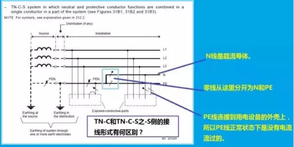TN-C-S區別于TN-C,就在于PEN在重復接地后分開為N中性線和PE保護線。
