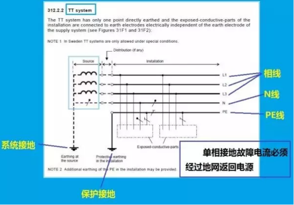 從符號代碼看,TT接地系統有系統接地,但它的保護接地采取直接接地的方式實現的。